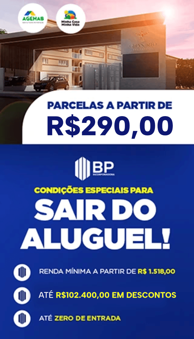 Economia: Parcelas que cabem no bolso e descontos de até R$ 102.400,00 com os programas Minha Casa Minha Vida e AGEHAB.